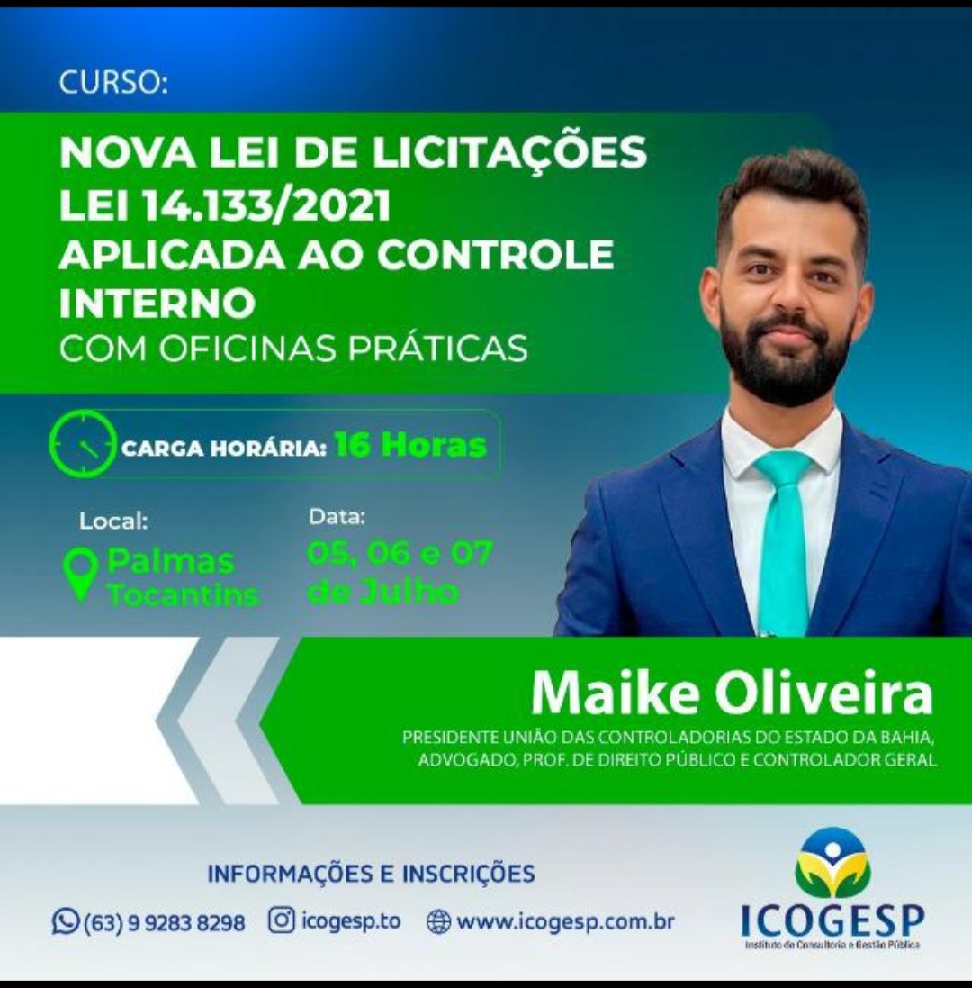 A presidenta da Câmara vereadora Ilsa Maia juntamente com a servidora chefe de controle interno da casa Irislene Gonçalves participam em Palmas nos dias 05,06 e 07 do Curso da Nova Lei de Licitações n ° 14.133/2021 Aplicada ao Controle Interno, com oficinas práticas. Sendo o referido curso ministrado pelo presidente da União das Controladorias do Estado da Bahia e também advogado, professor de Direito Público e Controlador Geral Maike Oliveira.