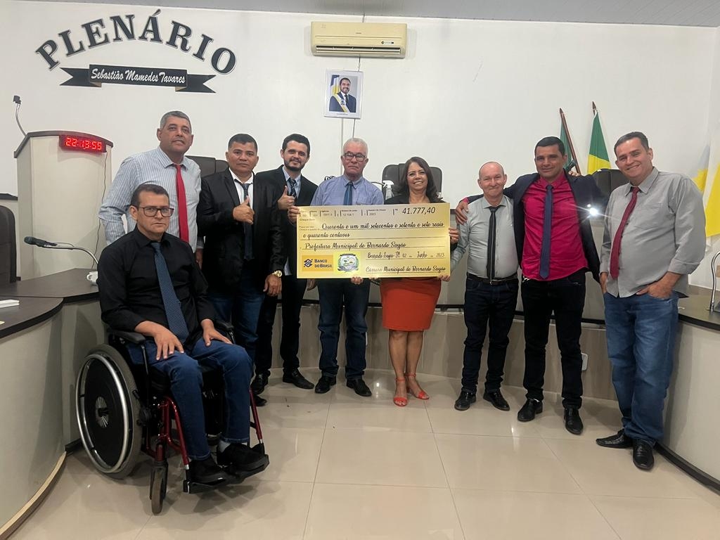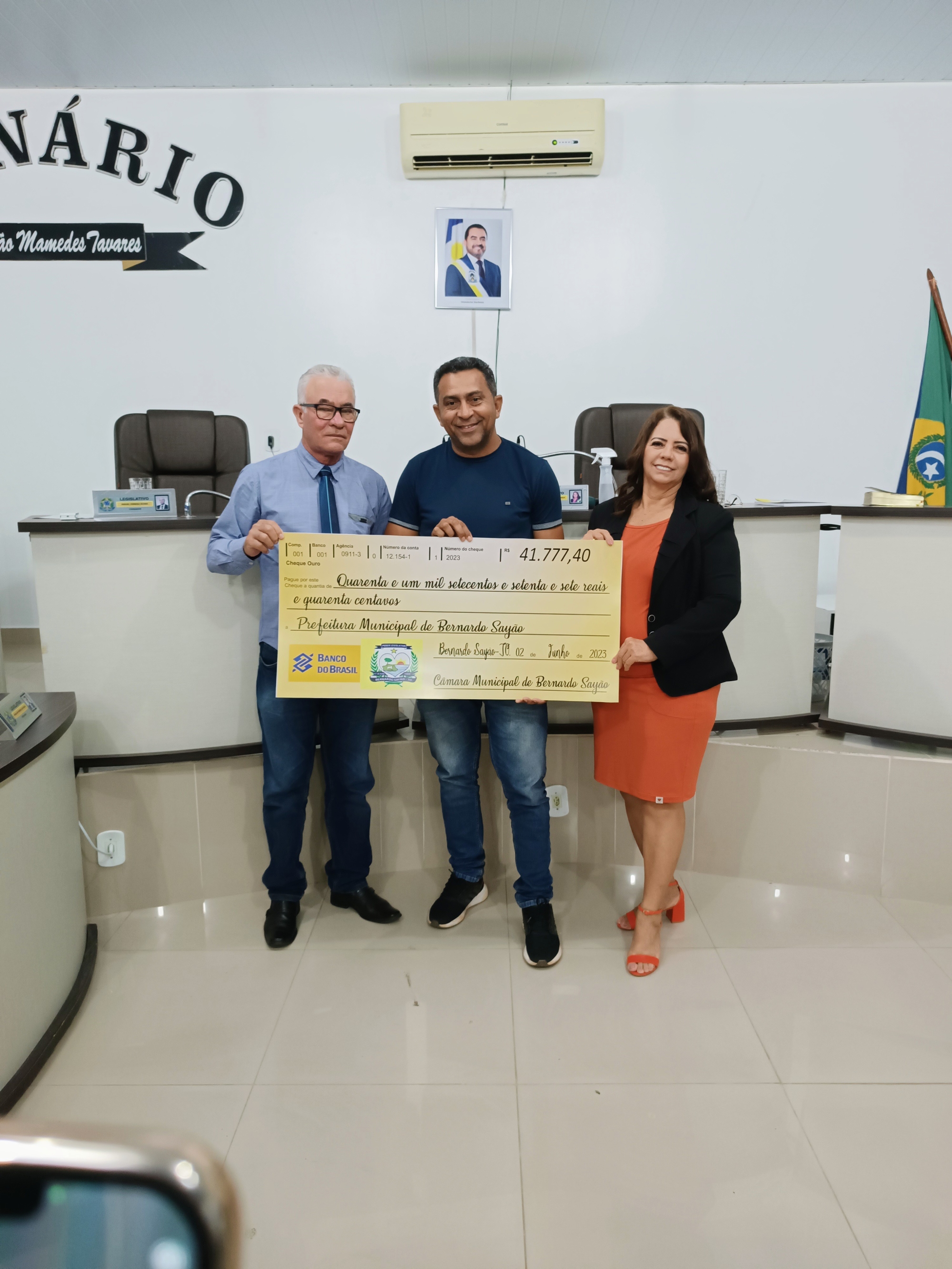 A Câmara Municipal de Bernardo Sayão sob a presidência da vereadora Ilsa Maia realizou nesta segunda-feira, 05 de junho, a devolução aos cofres públicos do poder executivo municipal de sobra de duodécimo em dezembro de 2021, do então ex-presidente Vilmar Rodrigues. A devolução no valor de R$ 41.777,40(quarenta e um mil setecentos e setenta e sete reais e quarenta centavos) foi entregue na Câmara Municipal pelos vereadores através de um cheque simbólico ao Secretario Municipal de Administração Gerson Barbosa, que esteve representando o prefeito Osório Antunes Filho, sendo esse valor conforme firmado com o prefeito, e reafirmado na fala do Secretario de Administração onde, esse montante será destinado a complementar a contrapartida do município a aquisição de um veículo para a Secretaria Municipal de Saúde de Bernardo Sayão, sendo esse veículo para executar serviços para o município, para a população.